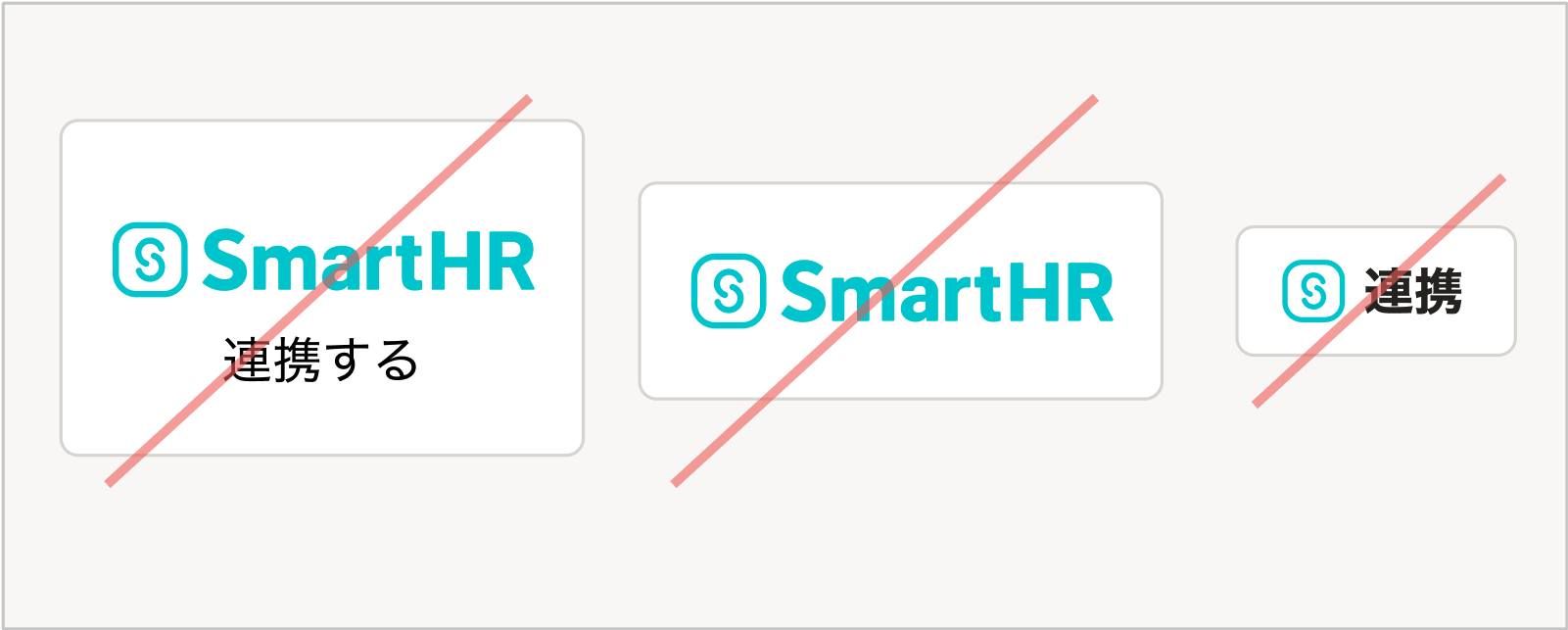 - SmartHRロゴをボタンの要素として内部に配置することは、ユーザーに誤解を与える可能性があるため避けてください。ロゴは、あくまでSmartHRというサービスを示す識別子として扱ってください。