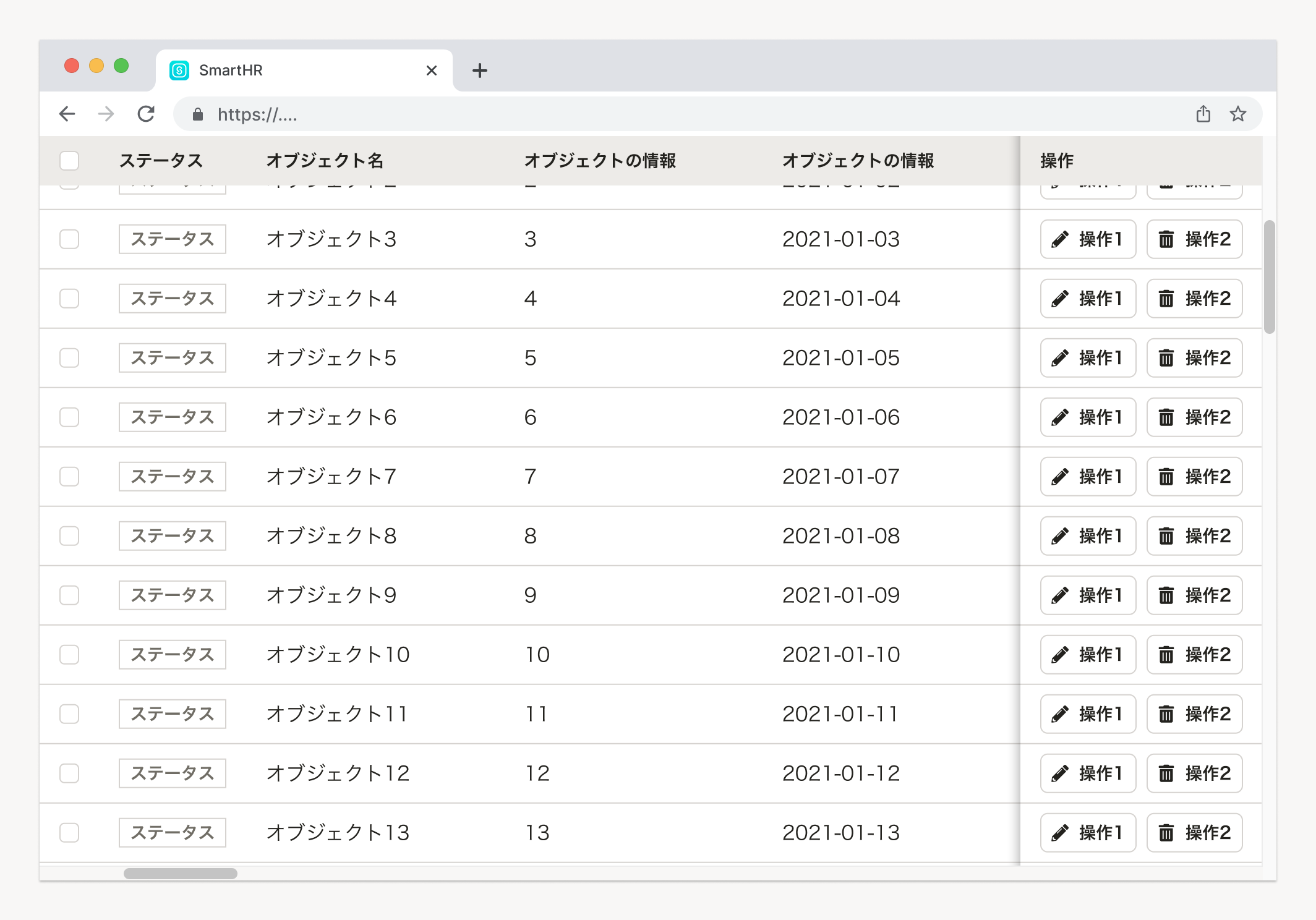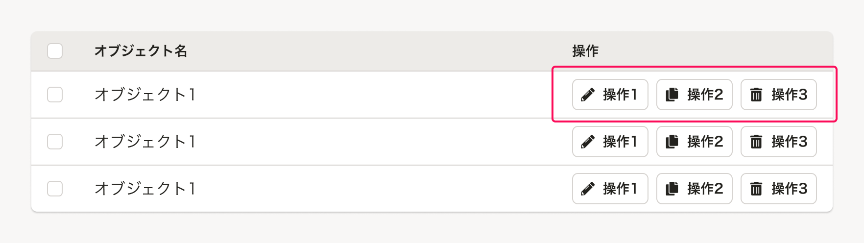 単一のオブジェクトに操作をしたい場合、アクションボタンをオブジェクト(行)それぞれに設置します。
