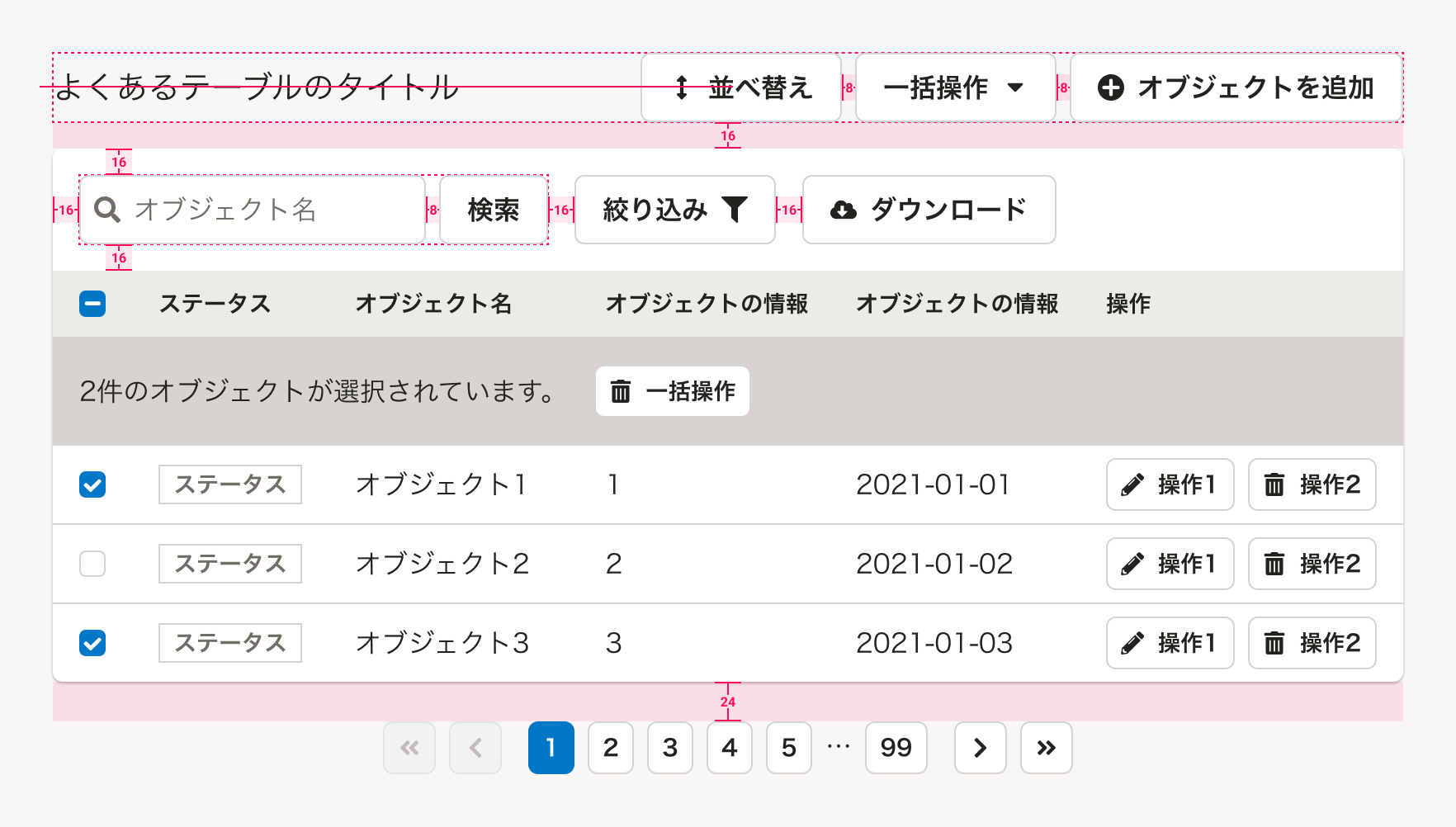 | テーブルのページ送り | - | テーブルのオブジェクトの量(行数)が多くなる場合に、複数のページに分けてPaginationを配置します。 コンテンツの横幅に応じて、表示する内容の量を検討してください。 |
