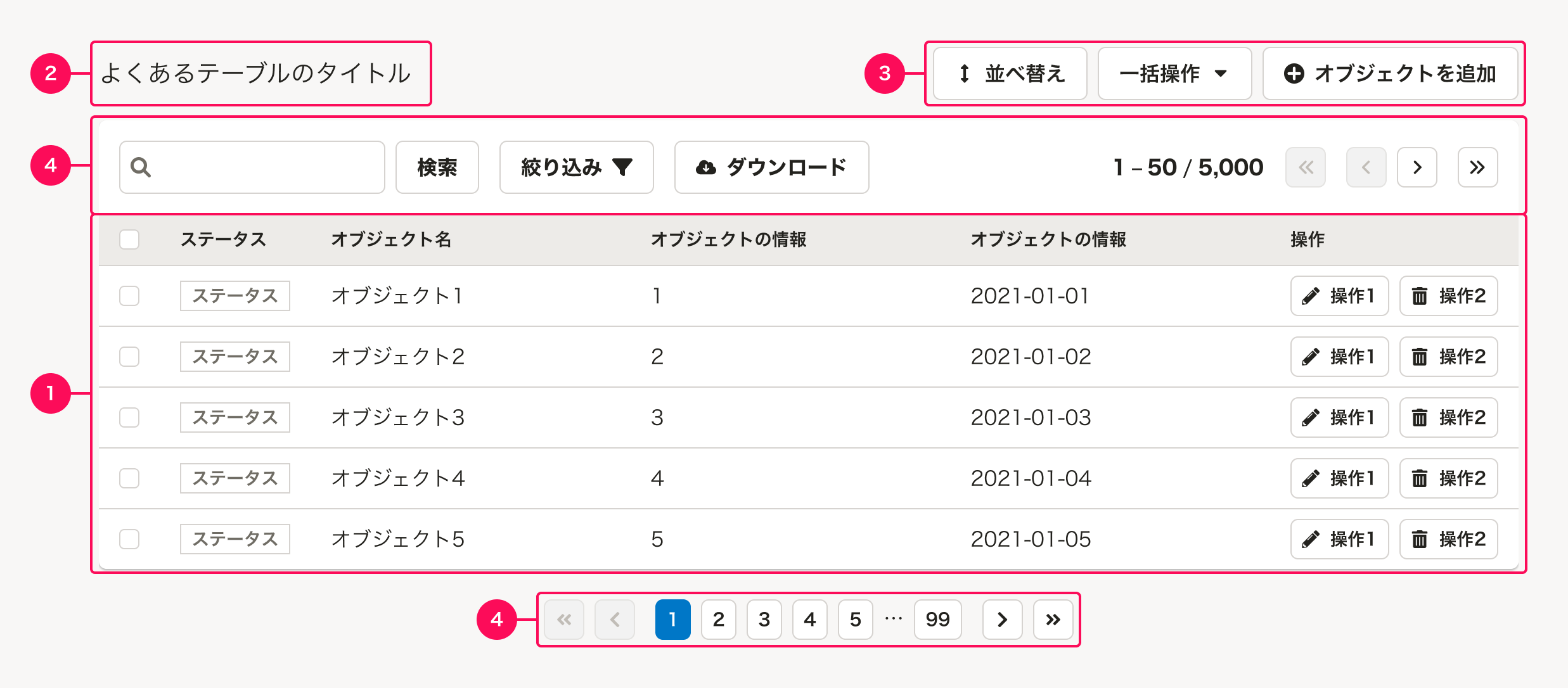 | テーブルのページ数、ページ番号 | 9,999 件中 1-5 件 | 多くの場合、「{総件数} 件中 {表示している順番の範囲} 件」のように、現在表示しているテーブル内容の現在位置を示します。1ページあたり20件〜50件とすることが多いですが、ユースケースや表示速度を考慮して適切な件数を設定します。 コンテンツの横幅に応じて、表示する内容の量を検討してください。 |