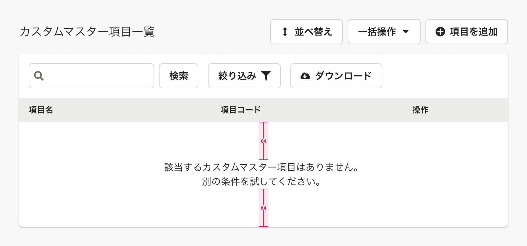 | オブジェクト(一覧)のダウンロード | ダウンロード, 全件ダウンロード | Secondaryボタンのアイコン付き(左)を配置します。(ダウンロード アイコン(FaCloudDownloadAltIcon)を使用)オブジェクトの絞り込み状態に依存せず、オブジェクトの全件が常にダウンロードされる場合は、ラベルを 全件ダウンロードとします。 |